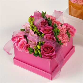 This exquisite pavé design features roses, hypericum and alstroemeria in a keepsake faux leather box.