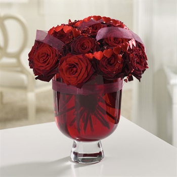 She'll say, "Yes!" when she receives this ruby red vase full of luscious roses, decorative hearts and gossamer ribbon.