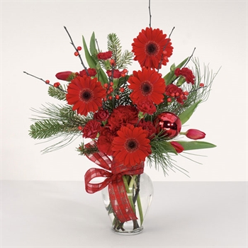 It's a festival of red and green for the holidays! Our freshest Gerbera daisies and carnations — even tulips — accented with greens and your good cheer!